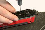Turn the locomotive on its back. Take off the centre pick-up by holding the pick-up at left and right with the tool provided. Then push the legs of the tool together and pull off the pick-up towards the top. The pick-up is held by two clips that are released easily after a somewhat powerful jerk.