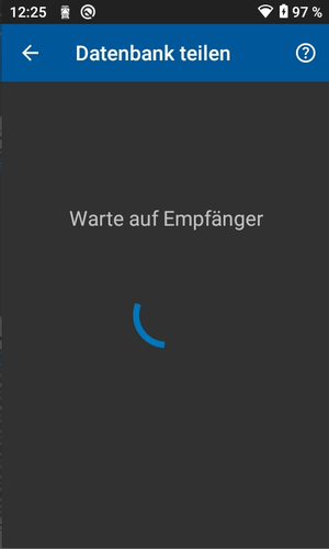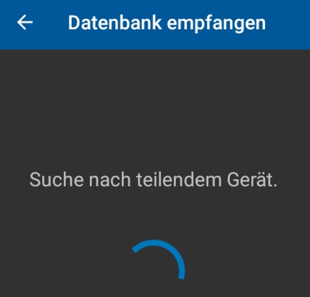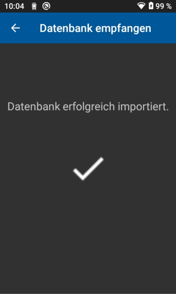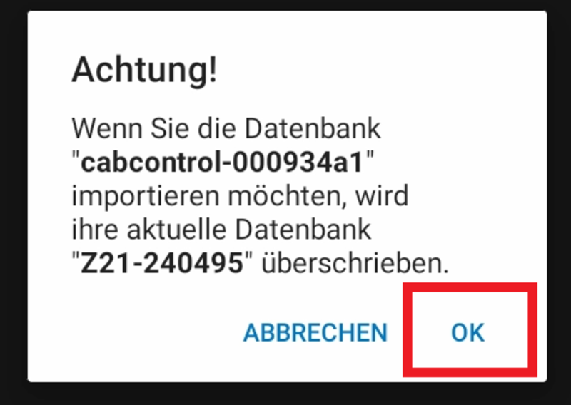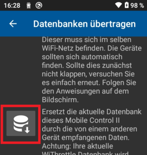 Navigieren sie zum zweiten Menüpunkt "Ersetzt die aktuelle Datenbank" und klicken Sie auf das Symbol, um die Übertragung der Daten zu starten. Bestätigen Sie die Warnung mit "OK".