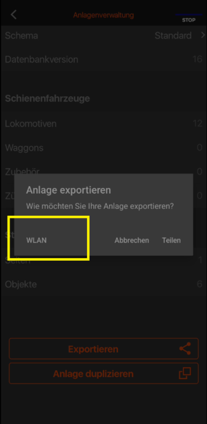 Wählen Sie danach "WLAN". Die Z21 App durchsucht nun das Netzwerk nach Apps, die bereit sind zum Empfang der Daten.