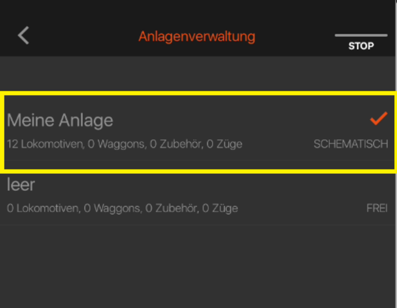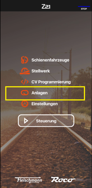 Starten Sie nun Ihre Z21 App auf Ihrem Mobiltelefon oder Tablett und wählen Sie "Anlagen". Wählen Sie danach diejenige Anlage aus, deren Loks und Magnetartikel Sie exportieren möchten.
