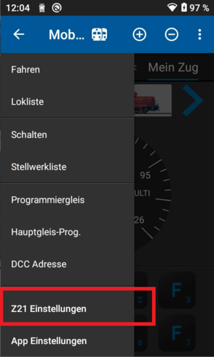 Rufen Sie aus dem Hauptmenü (Erreichbar über das "Burger-Menu" links oben) der Mobile Control Pro App die Z21-Einstellungen auf. Diese werden nur angeboten, wenn eine Verbindung mit einer Z21 besteht.