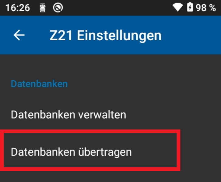 Wahlen sie den Punkt "Datenbanken übertragen" aus.